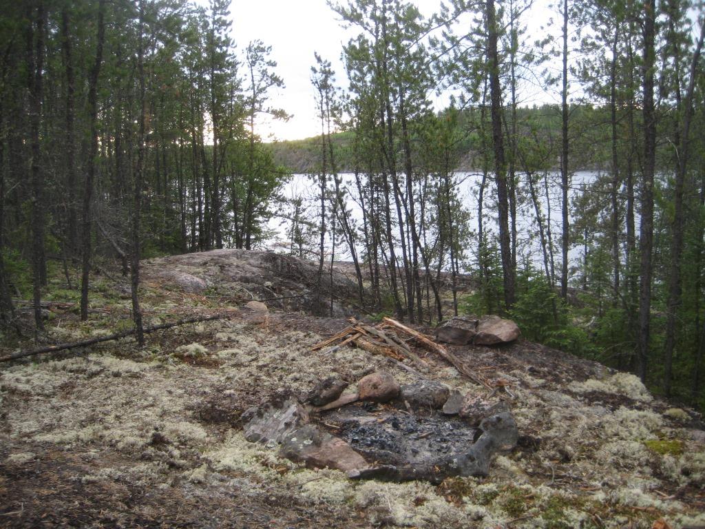Initially I created a small fireplace overlooking the lake for my late lunch, but it was much too exposed so headed inland about 100 metres. There is a flattish raised rock area in the pines that overlooks thick bush inland. I have to cut a trail from shore inland to the camp. In order to park the canoe at shore's edge I cut out about 20 trees, mostly birch.