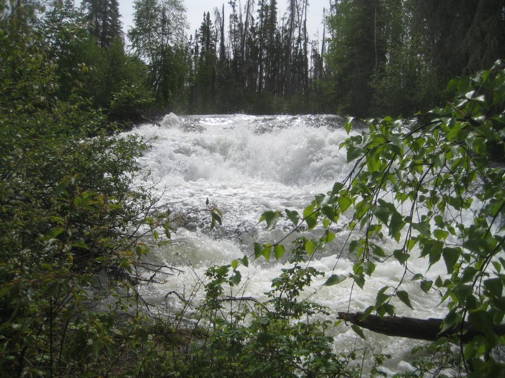 This is the waterfall of the lake's exit to the river from which I portaged. It would probably be a good spot for walleye fishing but I cannot find a place from which to cast a line without getting into the water.