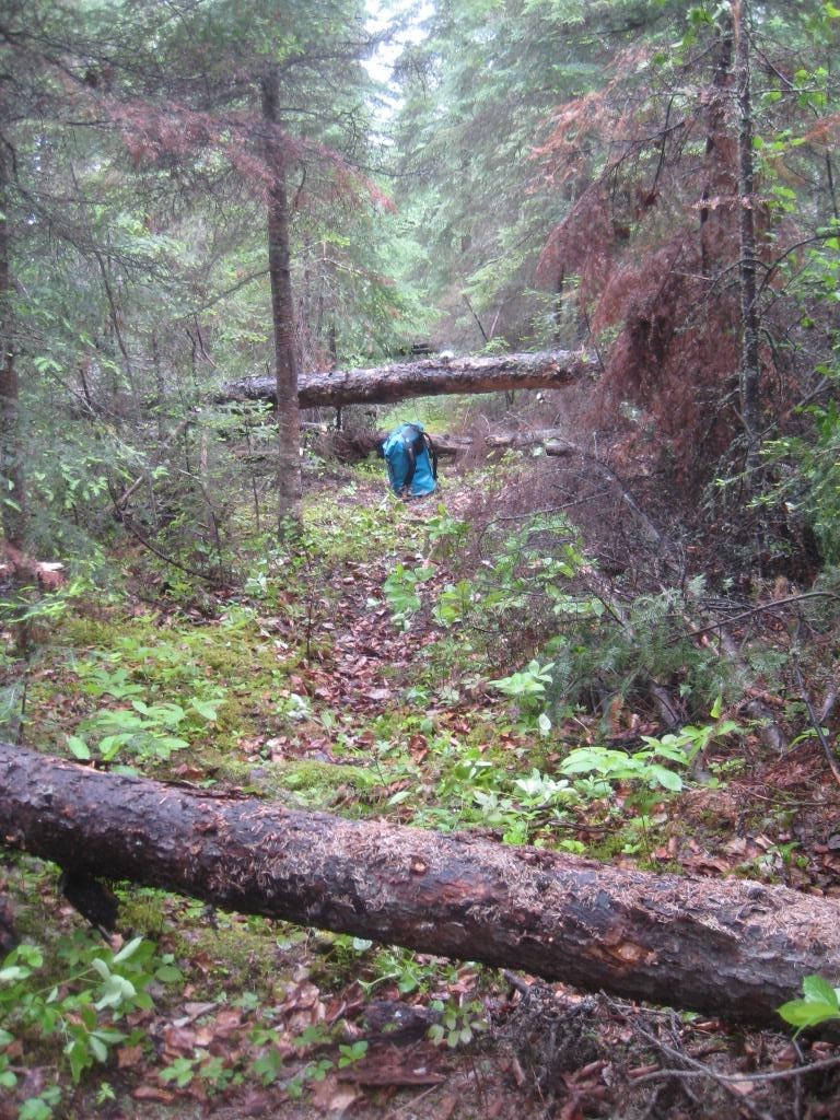 The following photos show the process of clearing the 600 metre portage trail, taking five hours over a period of two days. Some spots are completely blocked with many down trees and have to be unjumbled in a specific order to be removed. It is mostly saw work, with some axe work to remove protruding limbs, and some pruner work for small trees and some branches. Big game has been detouring off to the side, meandering through the trees closer to the river. In some places it is hard to tell where the old trail is, so I walk ahead to make sure I am clearing the correct spot, sometimes working backwards to connect to the cleared trail. It rains on and off while working, and once it pours heavily and I get quite wet. Whether from rain or sweat I am going to get wet, but I can look forward to getting dry and to a change of clothes in the warm tent. Warblers sing in the rain to accompany me. The trail is quite level and there are only two small wet stretches where I can walk at the side. The lower end of the portage is down a steep slope beside the end of the rapids at a small falls which prove to provide good walleye fishing. There are several large trees that cannot be cut with my saw. Some I can step over, but two I have to portage loads under which is a pain because I must set the loads down and then pick them back up again. These two trees I have to lower the canoe and push the canoe across before picking it up again. (On my return trip, two canoeists with a chain saw have cut out these large trees, making the portage much easier. Thanks to Dave and Jim ... much appreciated!)