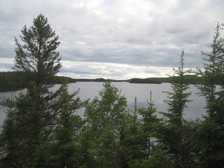 View down the very long lake, quite cloudy with light intermittent rainfall. As I paddle, I take note that there do not appear to be many likely "good" campsites, the lake being bordered by lots of black spruce and steep shoreline. Interestingly, I do spot two possible sites but not at any special places such as points or peninsulas. Stopping at the point of a long jutting peninsula, I walk inland to see if this is where Adam's cabin is, following a winter trail. Having confirmed the location, I canoe along the peninsula to find a campsite.