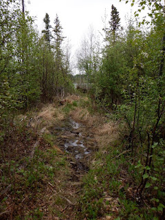Distance travelled 4.5 km, plus four extra km over two days to check portage and four hours to clear the 870 metre muddy trail. Bothersome blackflies mandate use of headnet. Ruffed grouse beside trail. Very very very heavy rainfall, then to bed without supper.