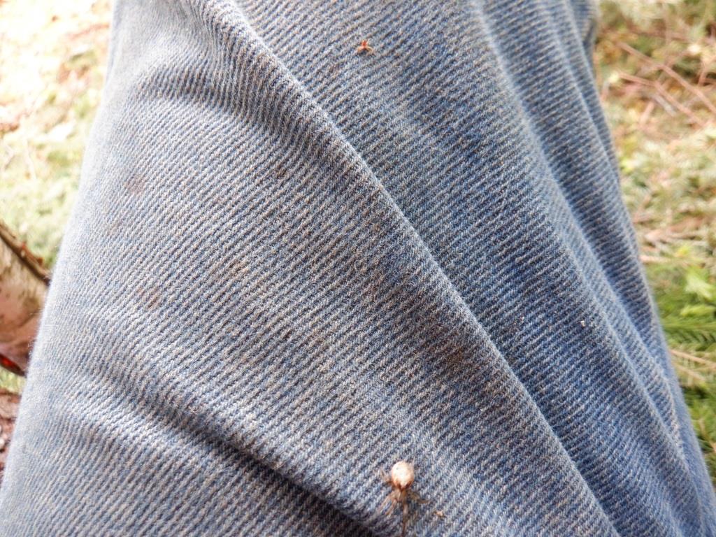 Sitting on spruce boughs under the Tarp shelter, there are dozens of the usual small spiders that live in the branches, some crawling under my shirt.